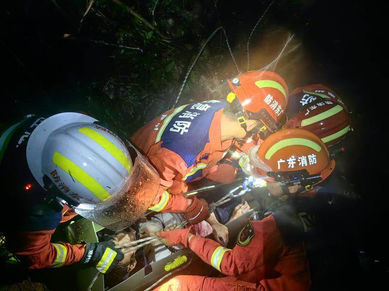 到达山坡底部,所幸车上人员意识还处于清醒状态,但因受伤无法自行移动。消防员一边安抚伤者,一边用多功能担架对伤者进行转移。经过多名消防救援人员轮流接力、翻山越岭,于当晚8点顺利将伤者转移到山路上,并移交给120医护人员。